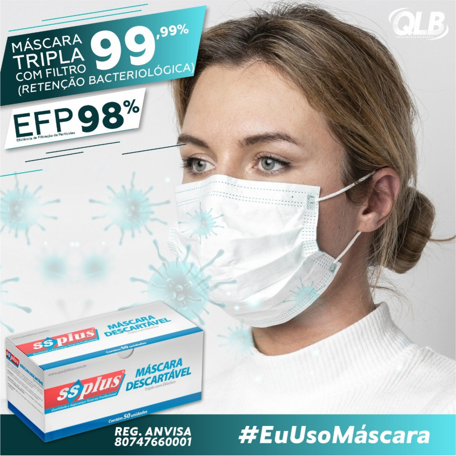 Máscara tripla com 2 camadas de TNT, com uma camada interna de filtro meltblown (EFB 95.8%).