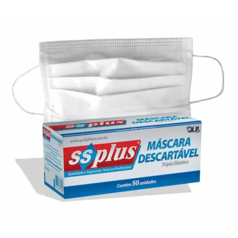 Máscara Cirúrgica Descartável Tripla com Elástico - SSPlus - Kit com 10 Cxs c/ 50Und